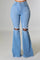 Full Length 5 pocket flare jean features ripped detail frayed hem, Medium Blue wash, 34" Inseam, made in Los Angeles