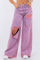 Wide Leg Denim Pants, features ripped detail, frayed hem, Pink Stone wash, Elastic waistband, Front button and zipper closure, Non Stretch Denim, 34" Inseam, 12.5" Rise, Made in Los Angeles